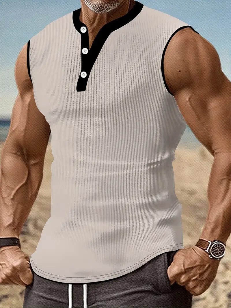 Camiseta sin mangas abotonada a juego con el color de los hombres, blusa casual sin mangas con cuello alto, ropa de hombre para el verano al aire libre