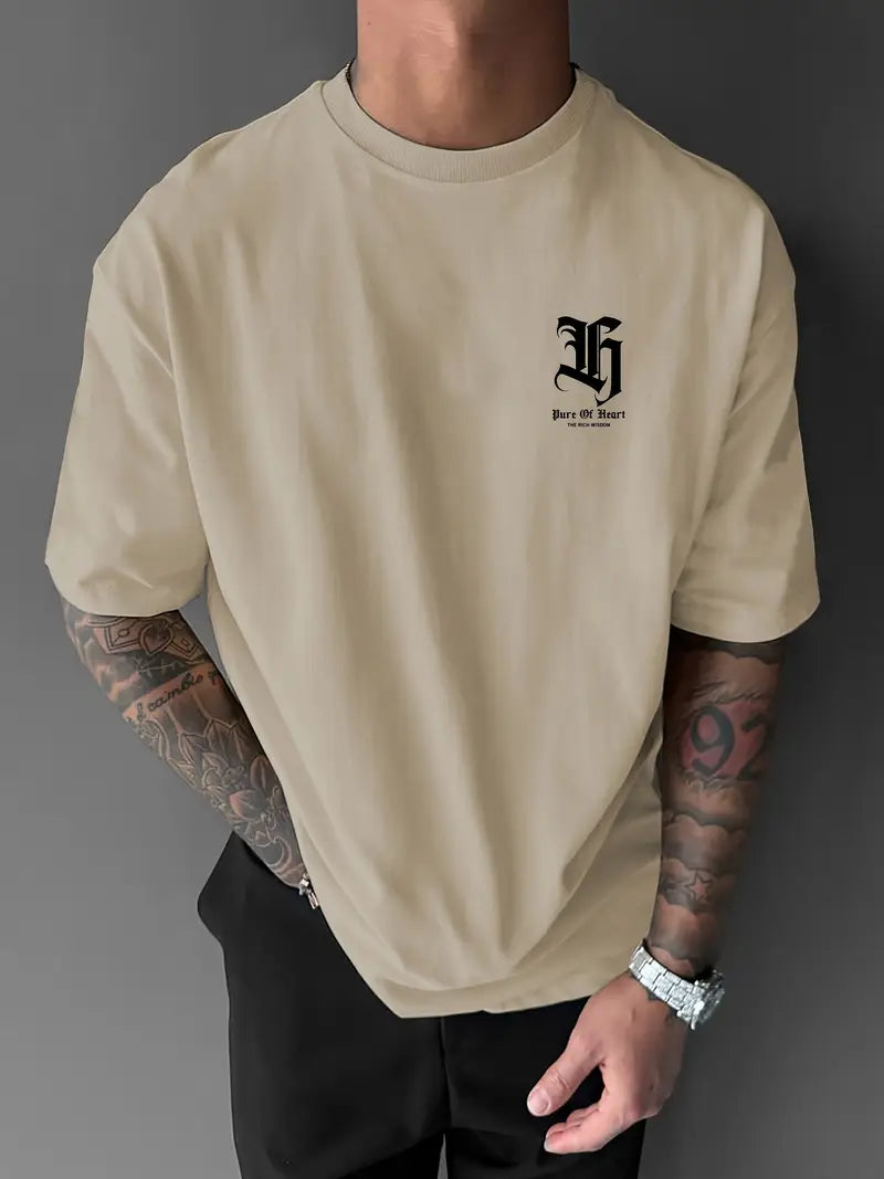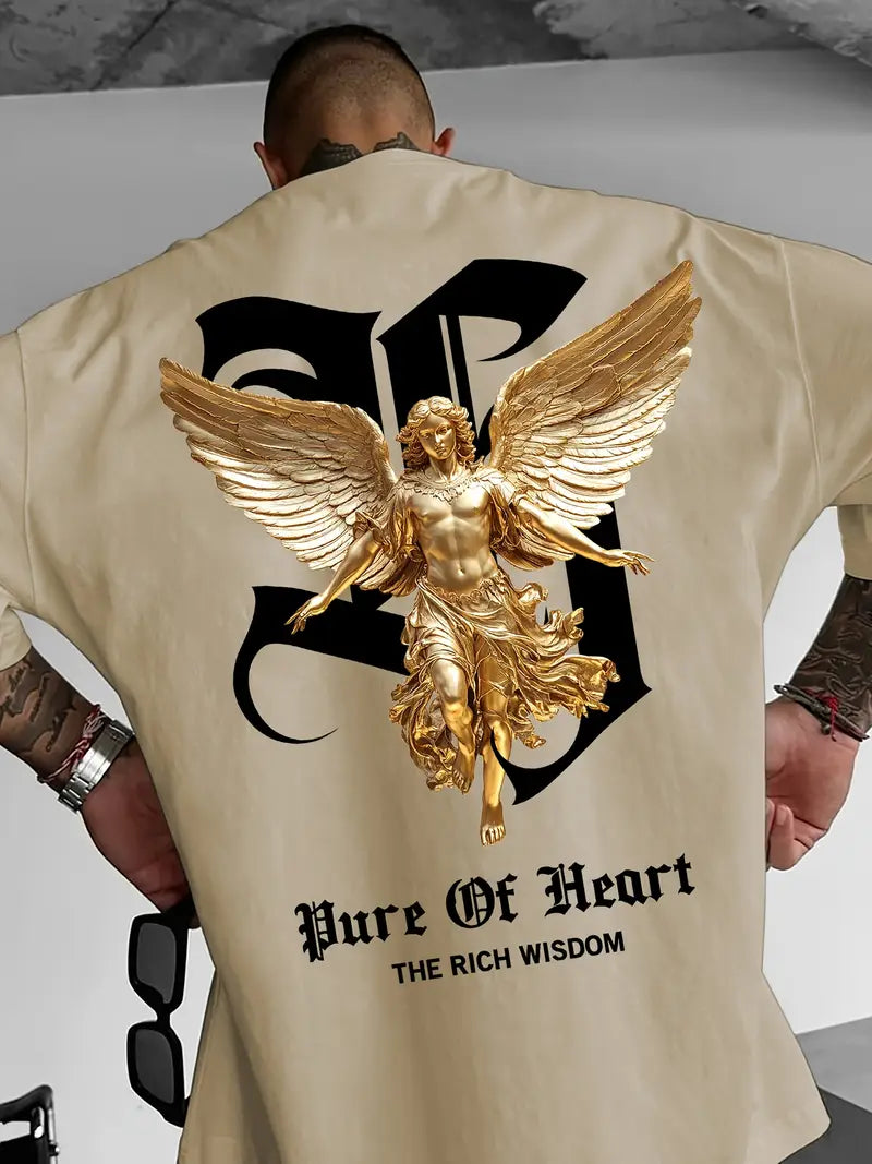 Camiseta gráfica de streetwear para hombre - Camiseta casual de verano 100% poliéster con estampado de alas de ángel y letras holgadas, negra con detalles dorados, lavable a máquina, ropa de estilo urbano | Diseño de ángel audaz