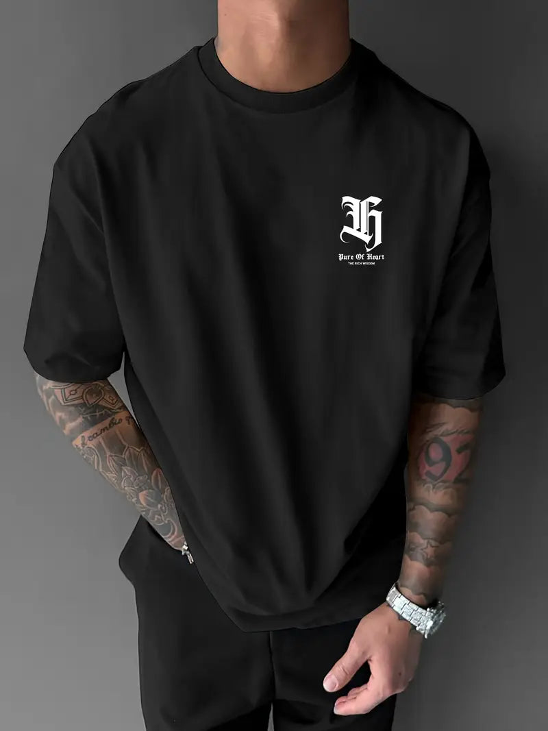 Camiseta gráfica de streetwear para hombre - Camiseta casual de verano 100% poliéster con estampado de alas de ángel y letras holgadas, negra con detalles dorados, lavable a máquina, ropa de estilo urbano | Diseño de ángel audaz