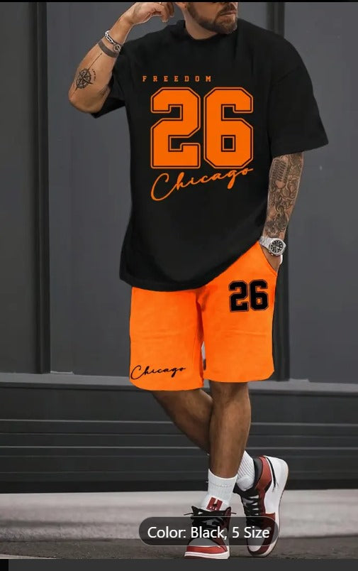 Conjunto de ropa deportiva informal para hombre, de 2 piezas mezcla de poliéster transpirable, combinación de camiseta y pantalones cortos estampados. Tamaño : Mediano