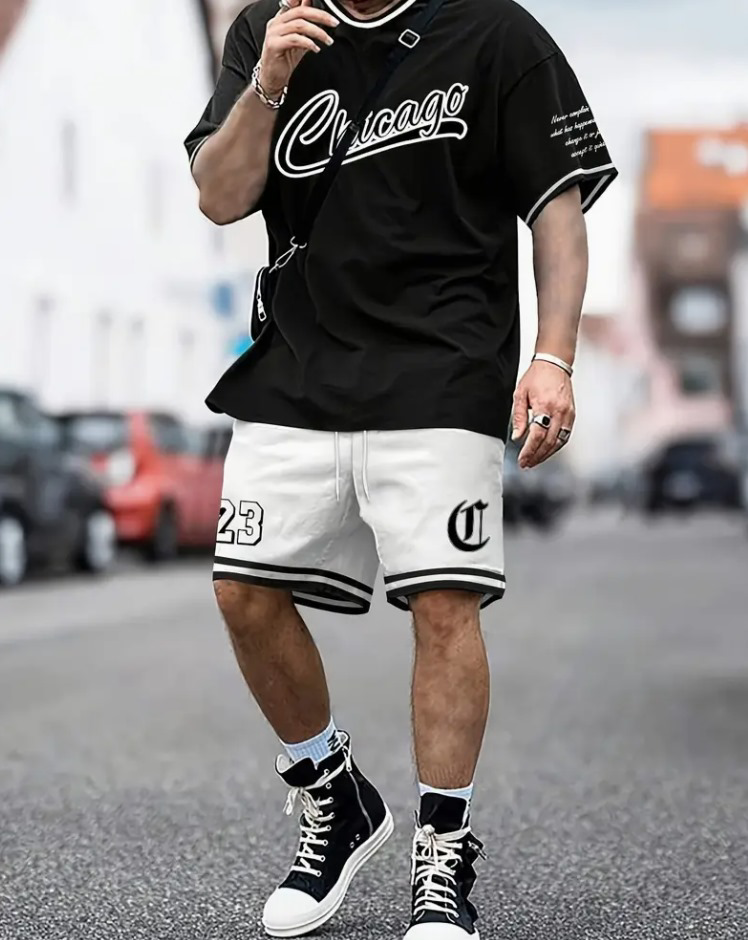 Conjunto informal de 2 piezas con estampado gráfico de Chicago: camiseta corta y pantalones cortos de manga corta para hombre. Tamaño: Mediano