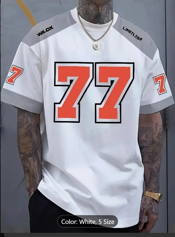 Camiseta casual para hombre, manga corta, cuello redondo, top deportivo con gráfico WILDCX, diseño rojo y blanco, poliéster ligero para vestimenta casual.